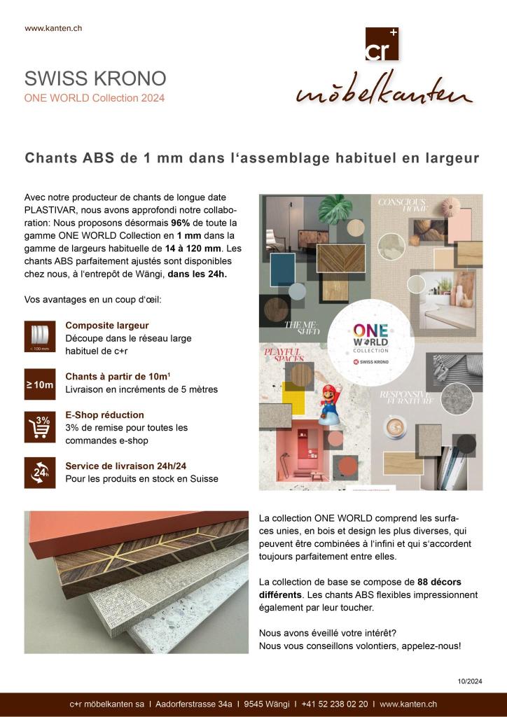 Avec notre producteur de chants de longue date PLASTIVAR, nous avons approfondi notre collaboration: Nous proposons désormais 96% de toute la gamme ONE WORLD Collection en 1mm dans la gamme de largeurs habituelle de 14 à 120mm.